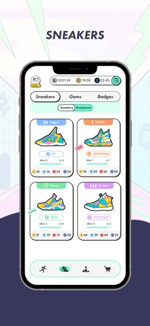 用户以运动鞋的形式为自己配备NFT。通过步行、慢跑或户外跑步,用户将收集GST和NFT。