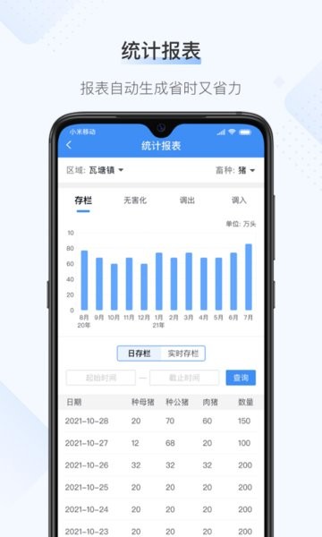 实时显示区域养殖数据,存栏数、调入数、调出数、死淘无害化数多维数据展示,支持条件筛选,你要的都有。