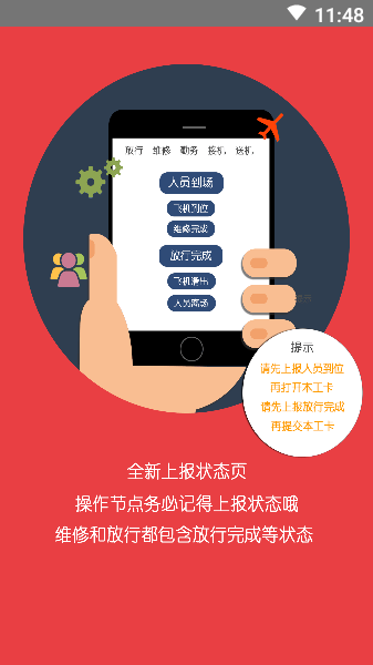 -- 人员到场、例行打卡,申请航线任务,执行工作单