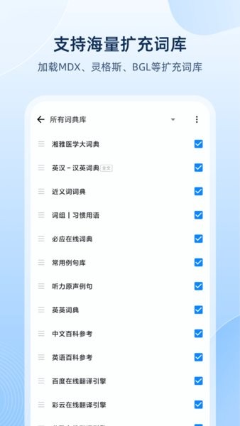 扩充词库:通过网络下载各语种的扩充词库,支持Mdict、灵格斯、Babylon等多种词典格式,覆盖医学、经济、工程、计算机等十余个领域。