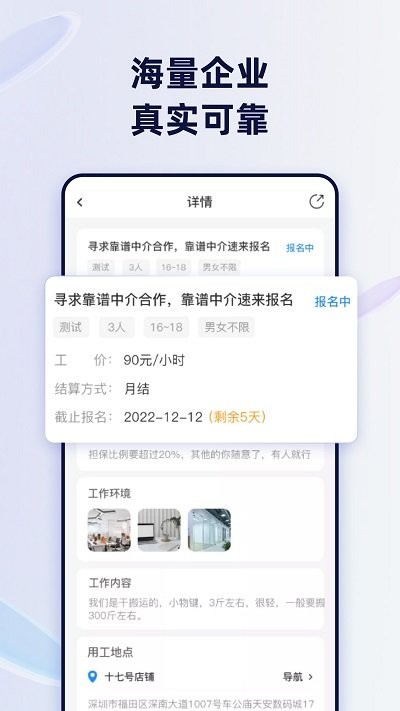 余时保中介版app是全新打造制作的招聘管理软件,面向中介朋友使用。这里汇聚了大量企业中介资源,实名认证,人员招聘数据真实,海量岗位状态一手掌握,可以随时在线直聊,轻松招聘,快速上岗,使用简单易上手,提高上岗工作的效率!