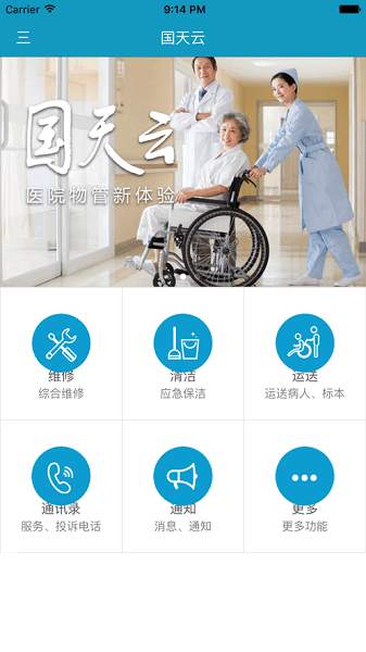 任何医生、护士、及相关人员,均可通过“国天云”快速进行医院常规运送、维修、清洁任务的发布。北京国天健宇物业管理发展有限公司将24小时值守并第一时间完成相关工作任务的调度、分配。
