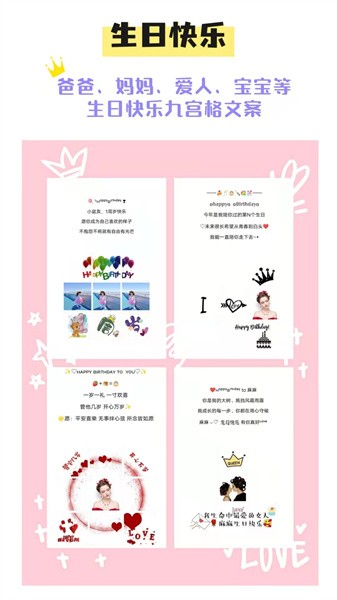 美图文案,各种精美九宫格图,朋友圈、节日祝福、生日祝福、日常晒娃、情人节、美食分享、萌宠日常、旅行游玩、日常恩爱,让您能快速找到所需素材,让你的朋友圈不再单调无趣。