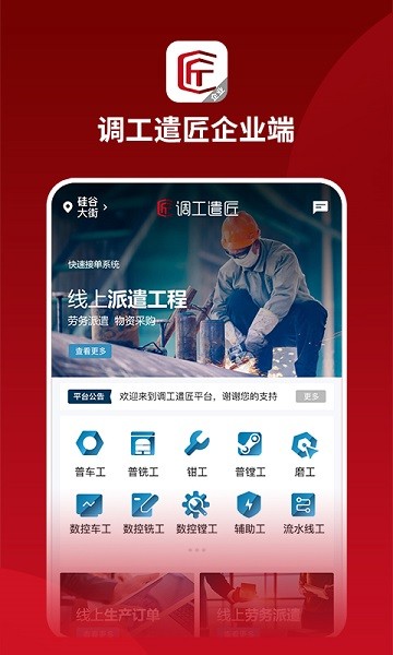 调工遣匠―可靠的灵活用工、生产订单及标准件采购平台,围绕互联网+工业平台运营、工业制造业、技工人才、企业发展的灵活用工需求,打造了线上订单版块、用工版块、商城版块、教育版块、劳务版块等多项细分产品,帮助生产企业解决现存问题,形成完整的服务闭环。