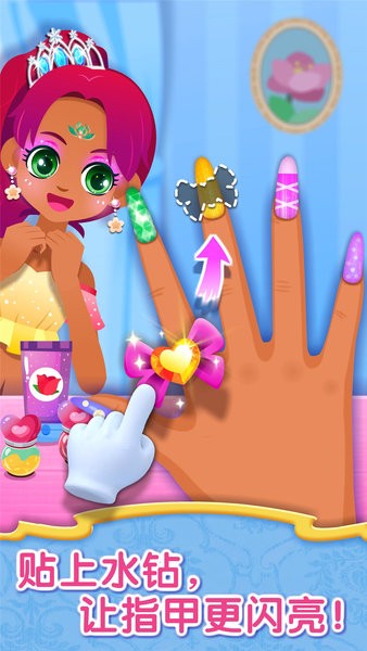 6.美甲设计:仔细修剪公主的指甲,为她涂上指甲油,点缀个性贴纸和珠光水钻,让指甲闪耀起来。