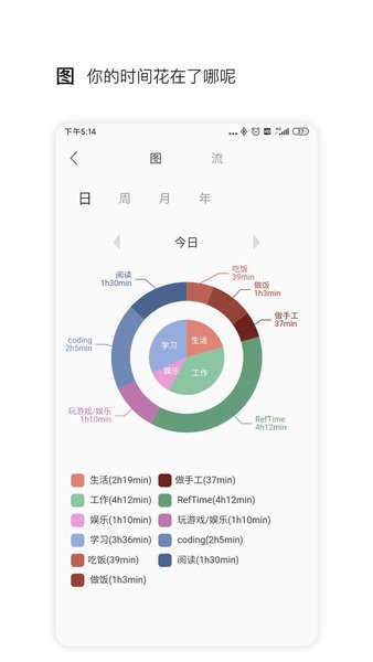 4.统计图表,根据消耗的具体时间来生成圆形统计图,了解不同事项的占比。