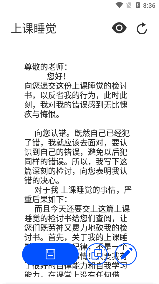 例如上课睡觉,字数800,即可生成检讨书。