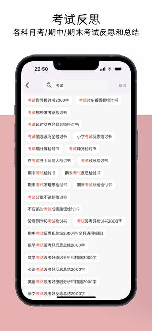专注对小学、初中、高中、数学、英语、语文、物理、化学、生物等考试总结分析,结合实际场景对考试不理想的反思,帮助学生更好提升考试技巧。例如:小学初中高中数学考试反思检讨书、考试退步检讨书、考试审题不仔细检讨书、考试粗心检讨书、考试分数不达标检讨书、学习状态不好检讨书、月考期中期末反思检讨书等。