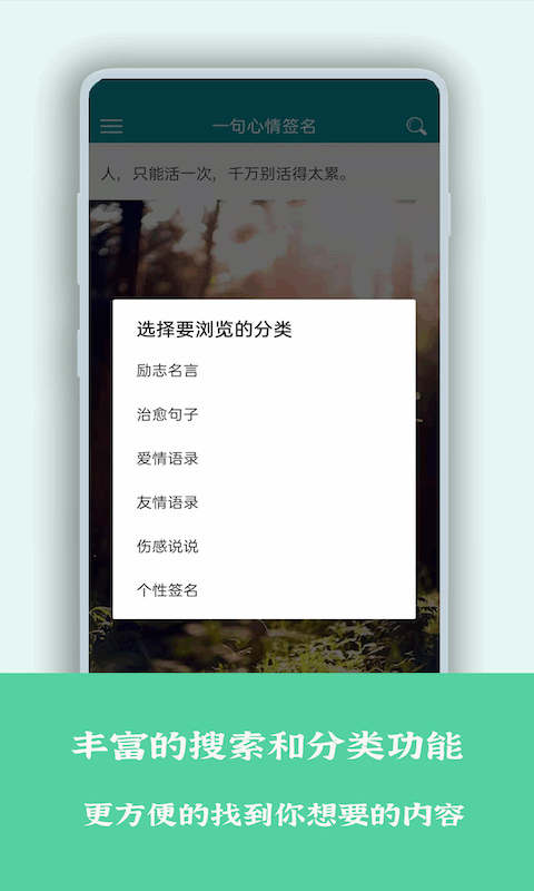 一句心情签名软件是一款提供个性心情签名的治愈性文字软件,每日一文,一期一会,励志名言、治愈句子、爱情语录、友情语录、伤感说说、个性签名应有尽有,随你自由选择浏览,带来不一样的体验,展现文字的力量,打造文艺朋友圈!