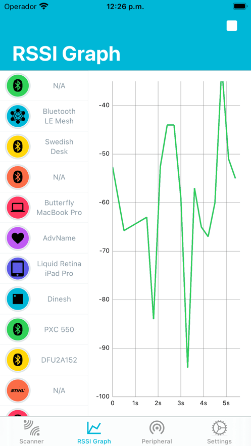 点击SCAN或者下拉界面,可以刷新设备列表,右滑界面可以看到每个设备的信号强度的变化曲线图,不同颜色代表不同的设备