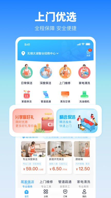 今往上门服务软件app主要为广大的用户朋友提供便捷的家政服务,包含的家政项目广泛,家政、保洁、维修、家电清洗等服务一应俱全,用户可以在线下单,支持预约时间,套餐价格透明,还可以领取店铺优惠。