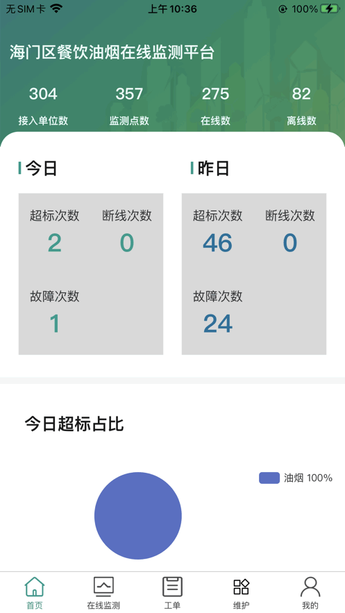 海门油烟监测app最新版能够清楚的查看企业的油烟排放情况,支持对接入的单位进行实时监测,超标、断线以及故障次数一目了然,可以根据地图来查看各个点位的详细信息,还能查看详细的设施维修保养情况。