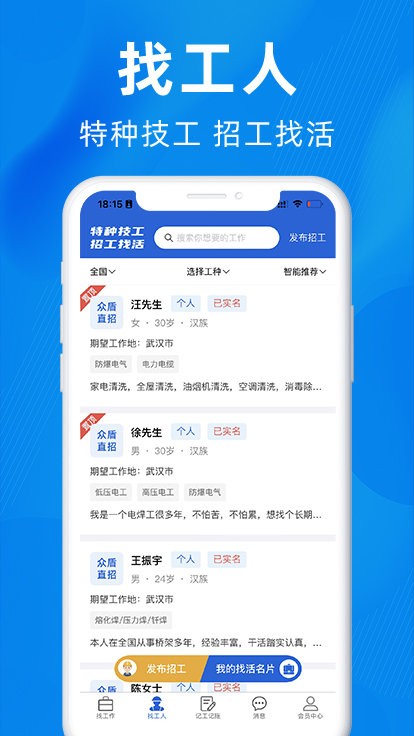 众盾直招软件手机版专为工地工程提供招聘服务,覆盖的工种类别齐全,工人师傅可以在线找适合的活,还可以制作找活名片,企业用户可以发布最新的工地用工需求信息,支持在线记工记账。