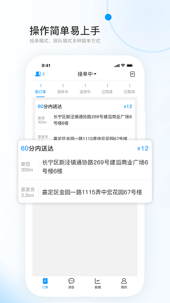 1、支持多种接单方式,任你自由选择,操作灵活,快速配送,管理订单信息