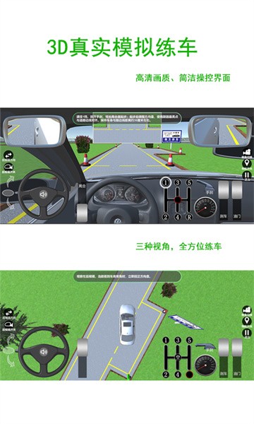 驾考练车3D是真实还原驾校科目二、科目三考试的3D模拟驾考软件,简洁的操作菜单,高清的材质画面、标准的3D车辆和3D考场模型,让你轻松高效的掌握驾考科目二、科目三的考试要领。其中科目二考试包括直角转弯、侧方停车、S弯道行驶、倒车入库、半坡起步、停车取卡等10个项目,并支持五项联考和自由练习;科目三考试包括灯光、起步、转弯、掉头、超车、会车、变更车道、加减档等15个项目;通过真实的方向盘操作,真实的离合、刹车和档位操作的演练,可以快速熟悉科目二、科目三考试的方法和技巧,快速熟悉考试项目的点位知识;