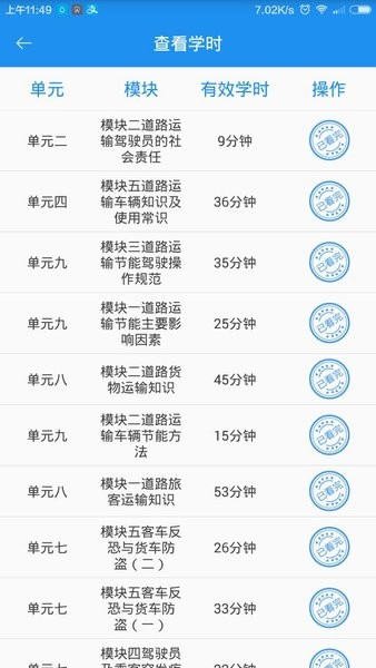 当学员测试通过后,系统将自动把学员学习信息提交给后台(运管处和驾校),此时在进度查询中会有提示。