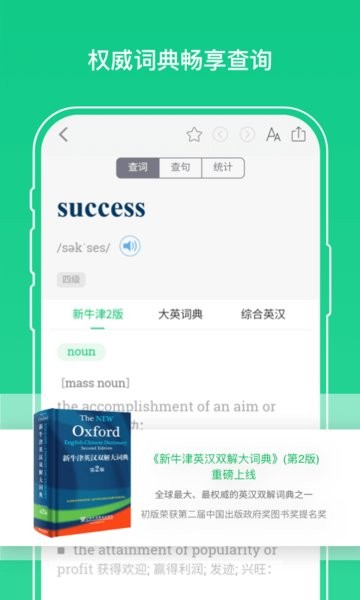 3.权威词典畅享查询:内置《新牛津英汉双解大词典》(第2版)、《外教社大学英语词典》、《外教社综合英汉大词典》等权威词典,满足用户日常查词需求。