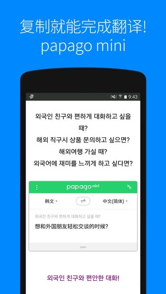 naverpapago官网app 安卓版(韩语翻译器)目前支持韩文、英文、日文、中文(简体/繁体)、西班牙文、法文、越南语、泰语、印度尼西亚语、俄语、德语、意大利语共13个国家的语言翻译。
