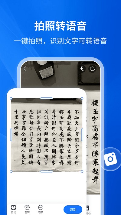 1、新增【拍照转语音】功能:一键拍摄快速识别文字转语音。