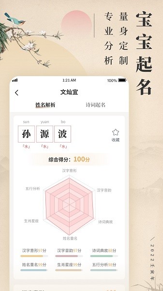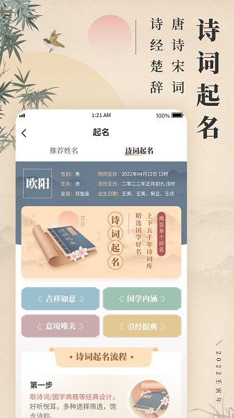 诗词宝宝起名取名是一款专业的起名软件、根据中国文化、古代诗词文化含义、内容等方面给用户提供适合匹配的寓意名字;根据中国古代文化、诗词含义赋予宝宝一个好的初始;古人云:赐子千金,不如教子一艺;教子一艺,不如赐子好名。
