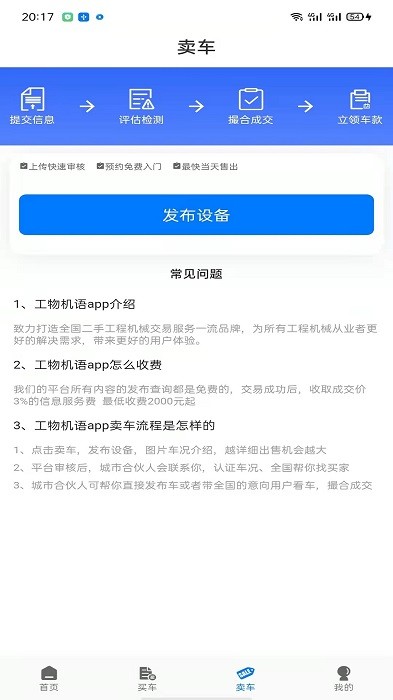 工物机语是一款二手工程机械信息咨询的app,发布设备的用户通过app发布设备信息,管理人员审核后,查看信息的用户通过app查看发布的设备信息,进入详情查看设备信息,并能联系发布设备的用户,咨询设备。但app不涉及交易支付等功能,请审核员详细审核。