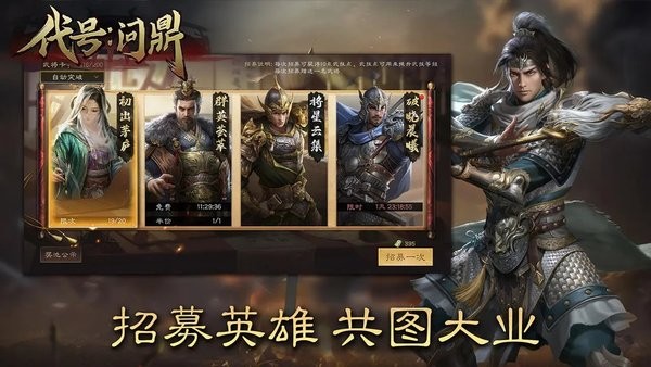 代号问鼎最新版是大型三国历史策略slg战争游戏,打造庞大的三国世界,聚集众多的武将英雄,随你招募培养,打造强大军队阵容,运筹帷幄,制胜千里。还支持联盟作战,跨服竞技,掠夺资源,赢取胜利,获得成就经验,画面复古写实,玩起来精彩又热血!