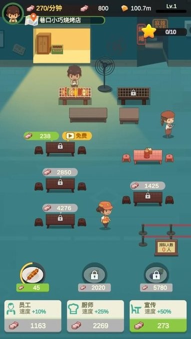 通过点击升级来获得更多色味俱佳的烤品,升级服务员和厨师的等级,满足食客们的口腹之欲