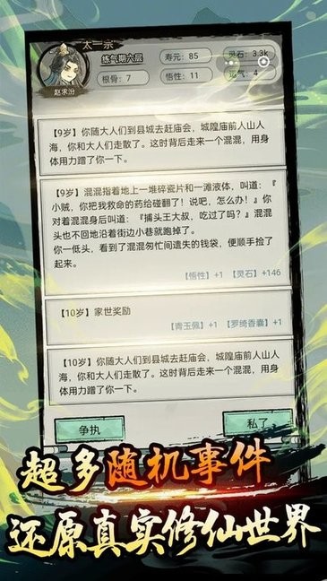 游戏中有多种主线剧情,根据不同的运气、家世、天赋、传承、宗门,玩家将经历不同的人生故事。这些剧情不是简单的随机事件,而是有铺垫、有来龙去脉、有不同选择之后的不同后续。玩家的每个决定都将在故事中产生深远的影响。