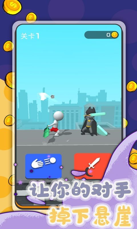 首先,让我们画一把武器。随意画你的武器,但要注意剩余的墨水量!制作武器后,开始战斗!在正确的时间点击,让你的对手掉下悬崖!
