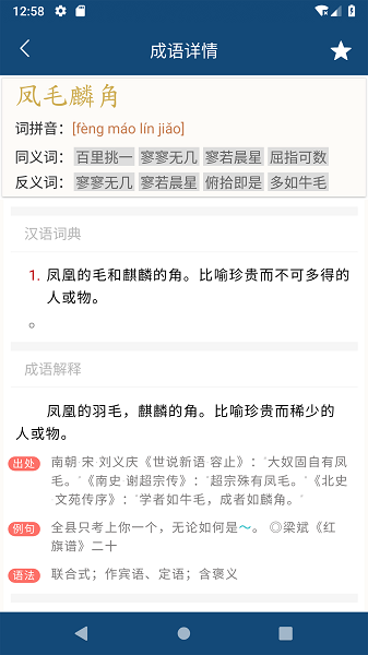 3.全功能:提示例子,近义成语,反义词。举一反三,更容易理解和掌握成语。