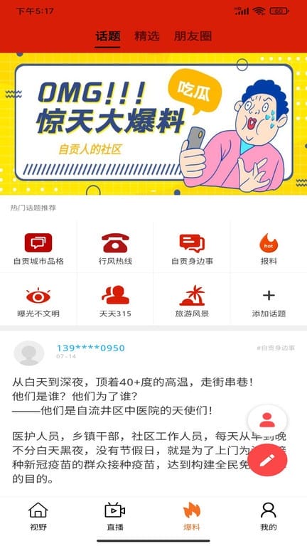 4、报料,你可以选择在这里面报料,你知晓的一些事物,同时还可以查看其它的用户报料的信息在这里面。