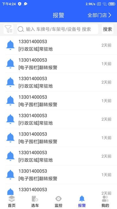 3、搜索查找报警信息,支持使用搜索功能输入车架号等关键词查找相应的报警内容;