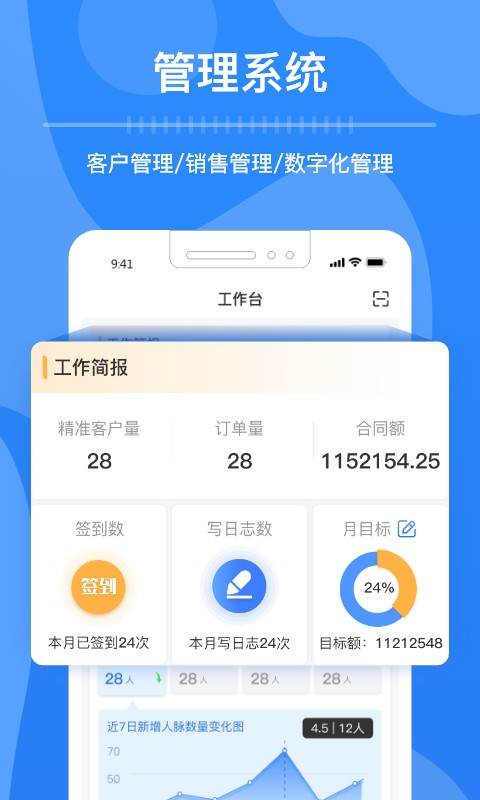 钢脉软件app手机最新版主要为销售行业的用户打造,用户可以在这里获客,拓展之际的人脉资源,可以查看每天的工作简报,客户新增数量、订单量、签到数、写日志数一目了然,能够在线找商机寻求合作。