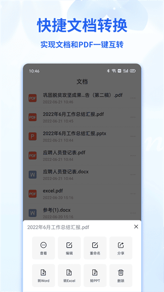 word文档编辑手机版提供pdf转word、pdf转excel、pdf转ppt、word转pdf、excel转pdf、ppt转pdf等格式转换功能。