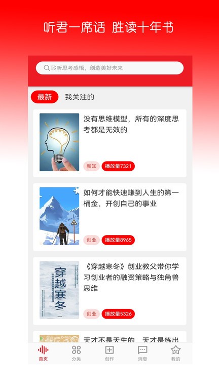 时空包是一个知识分享平台,专注于思维分析和深度思考。这里有很多音频资源,涵盖创业、个人成长、健康等主题,用户可以在线听或者用自己的声音为内容配音。软件还有创作中心,方便用户分享自己的感悟,甚至还能通过录制优质音频赚取稿费提现。
