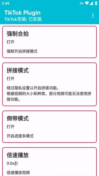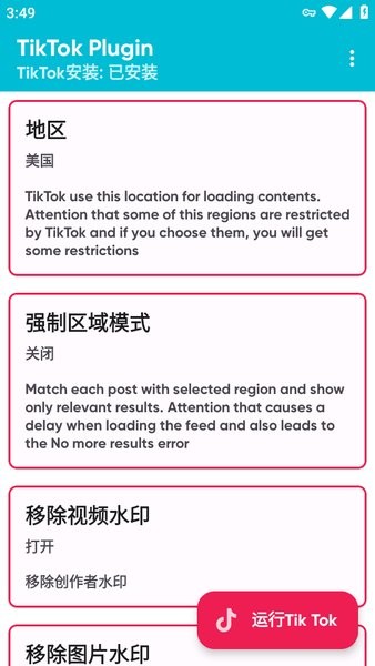 tiktok plugin插件(换区插件)app中文版是专为tiktok国际版抖音打造的换区器,相当于辅助工具吧!当然,软件是功能不仅仅只有切换国家地区,还提供了去水印、去广告、屏蔽直播等功能,是玩转tiktok的必备神器!