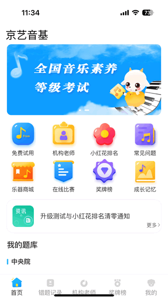 京艺音基app官方版是一款专门面向少儿提供音乐基础理论学习的应用软件,带来丰富的知识内容,大量的题库练习,打造掌上模拟考试系统,随时在线练习测试,参与比赛,获得小红花奖励,刷新排名,助力全国音乐素养等级考试上岸!