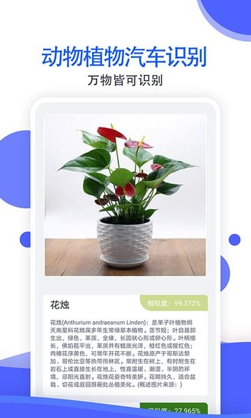 支持动物识别、植物识别、汽车识别、菜品识别、建筑识别、全能识别,丰富你的知识,让智慧伴随你每一天。