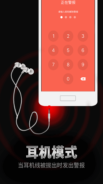 耳机模式:当耳机线被拔出或剪短时发出警报