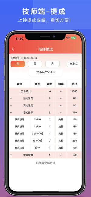 2、上钟后的提成业绩,系统即时记录并可供随时查询,让技师对自己的收入情况了如指掌,管理更加透明化。
