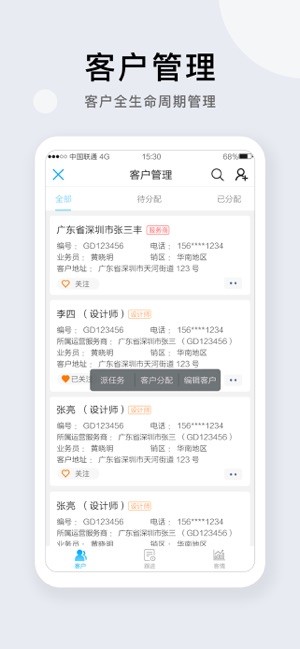 对客户的售前、售中、售后阶段自定义服务内容建立对客户全生命周期的服务标准,对服务行为、过程进行全程跟踪和数据沉淀。