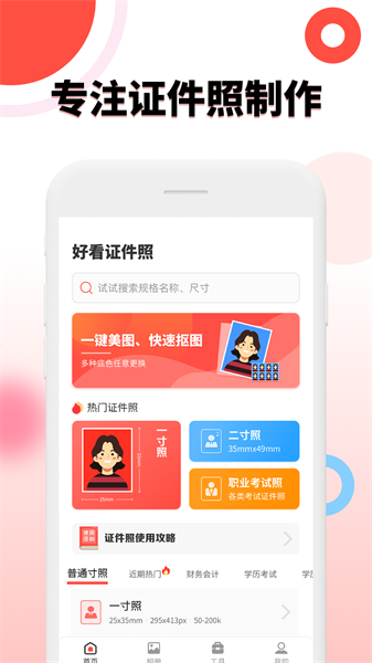 “好看证件照”是一款非常实用的手机应用,专门用来制作证件照。它有很多模板和素材,操作简单,不管你是新手还是老手都能轻松上手。软件里有各种尺寸的证件照,比如1寸、2寸,还有学生证、毕业证这些专业的规格,完全能满足你的需求。