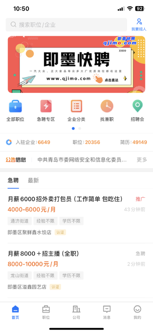 专业为即墨本地企业招聘、个人求职服务,每天提供即墨最新企业招聘/求职信息。即墨快聘―做用户最满意的求职招聘平台!