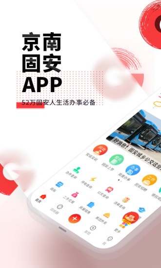 京南固安APP - 52万固安人生活必备,京南固安APP是为固安本地老百姓开发的一款便捷的社区和生活服务app,集新闻资讯、公告通知、同城社区、本地办事指南及办事进度查询等功能于一体。