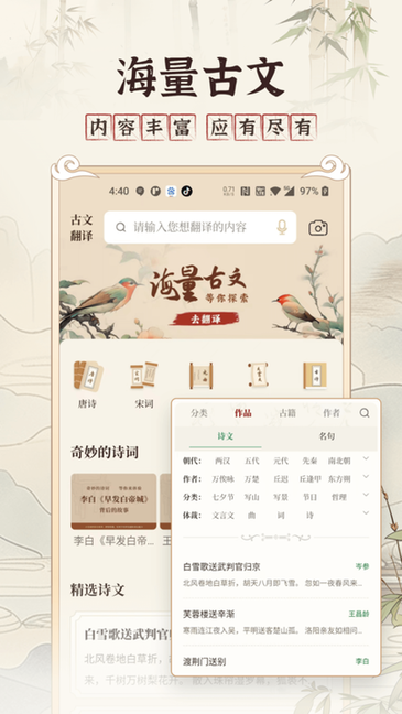 古文翻译器APP,专为文言文翻译、古诗词学习和文言文学习而设计,提供全面的文言文翻译功能,让您轻松跨越古今语言障碍,深入理解古代文字的内涵。同时,我们还为您准备了丰富的古诗词资源,帮助您领略古代文学的独特魅力。