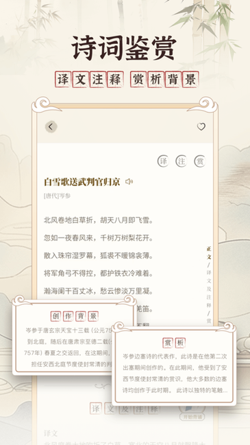 提供详尽的注释、译文、赏析、创作背景、作者等内容,我们用简洁易懂的语言为您解读难点,让您轻松掌握古诗词的精髓。更有古文背诵功能,帮助学生们快速记忆相关知识。