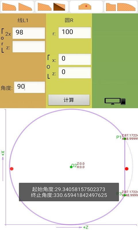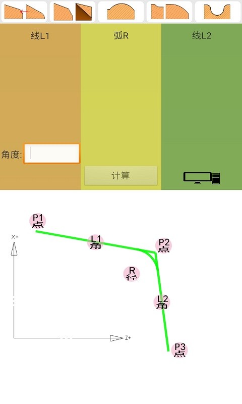软件用于数控加工程序编制中对图纸中倒圆、倒角等几何要素的计算,而且能进一步计算内、外切削时的刀具圆弧补偿轨迹与坐标。输入已知几何元素,能绘制出相应图形结果,并计算出未知元素的点、线和圆弧的坐标、起点、终点、直线角度、弧起始终止角度、长度等参数。是数控加工的好帮手,也能用于数学教学等。