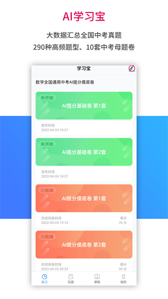 AI学习宝APP是一款专为学生打造的在线学习软件,提供了丰富的课程资源和历年考试真题,方便大家练习和提高。它利用大数据分析全国中考真题,总结出290个题型,并制作了10套铺码母题卷,帮助精准定位薄弱知识点。通过智慧笔和数据分析,还能提供名师视频讲解和错题变式练习,学习起来非常高效。
