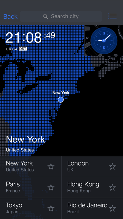 2、城市搜索,里面随时能在搜索框搜索不同地区时间,多地区还能做时差的对比。