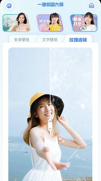 一键修图大师app软件,图片美化神器,素材丰富多样,创意无限。轻松给老照片上色,测年龄测颜值,滤镜多样,海量壁纸随心选。功能全面,让你的图片瞬间焕新颜,展现个性魅力!